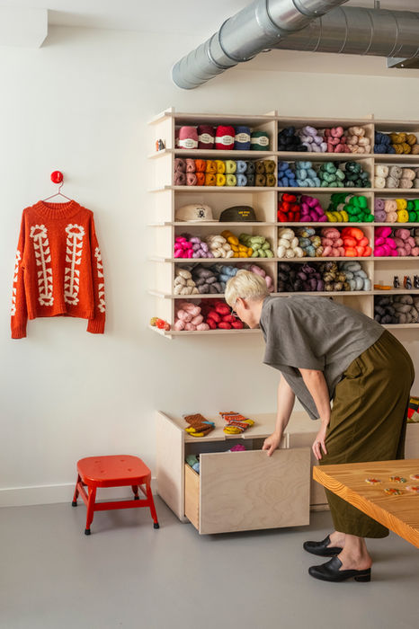 Knit Club, a yarn shop and creative community in Providence, RI, is a place for knitters and makers to gather, learn, and find inspiration. For the space, we worked with owner Degen to create a warm, minimalist interior where clean lines and pale wood let vibrant yarns take center stage. Designed as both a retail shop and a gathering place, the layout offers flexible shelving for changing displays, an open central table for classes and knit-alongs, and seating that encourages visitors to linger, connect, and create.
